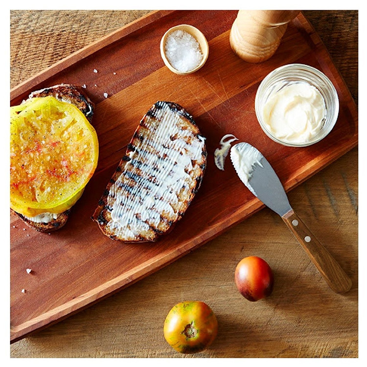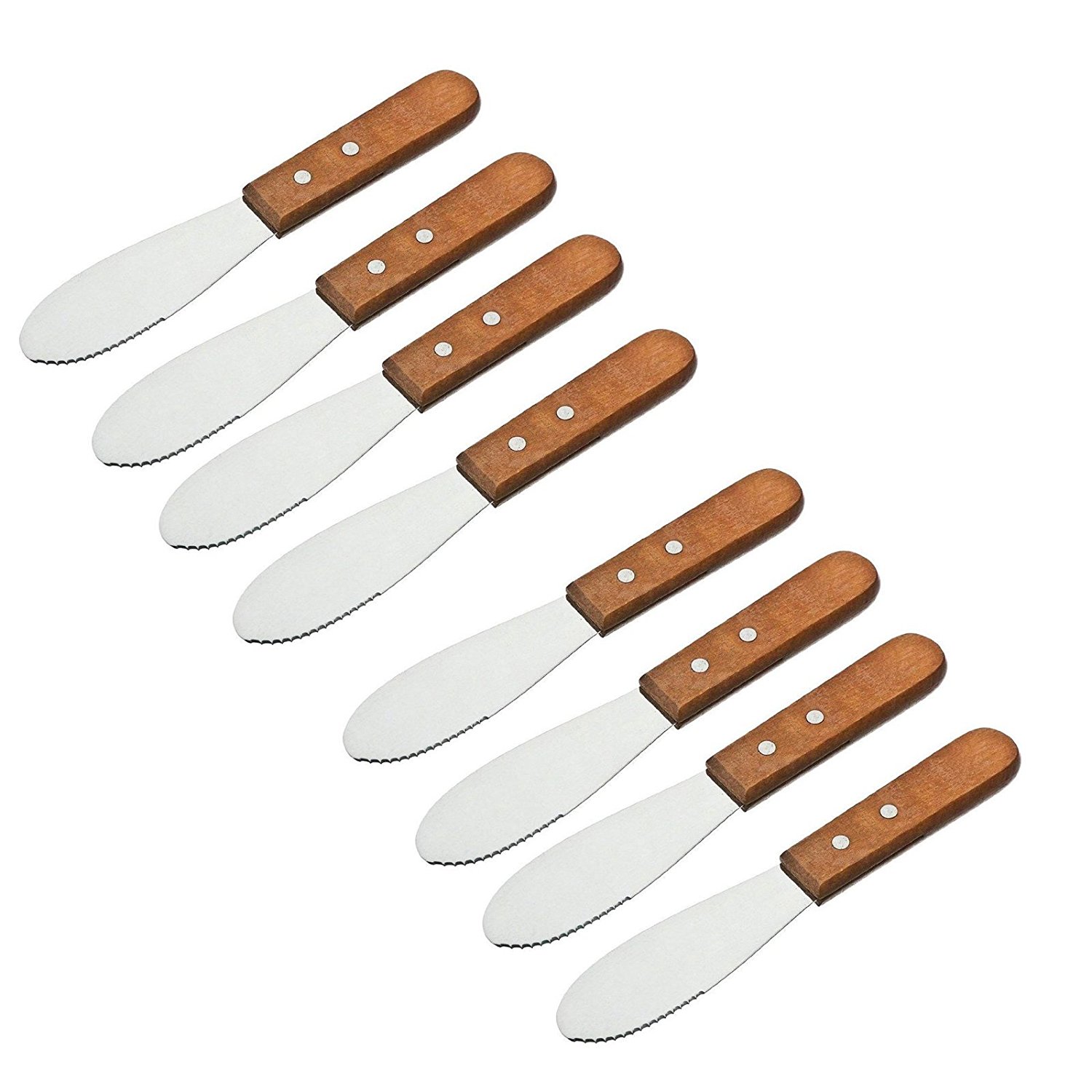 - • Well crafted, made with an easy to grip wooden handle and silver stainless steel blade. • Stainless steel spreader is equipped with a straight edge and regular knife side combination. • This spreader makes getting all your spreads on your food much more convenient. Great for butter, cheese and other condiments. • Stainless steel spreader measures 8″ inches long, from end to end. The blade measures 4″ inches long by 1.25″ inches wide. • A terrific value, available in 4, 8 and 12 knives per set.